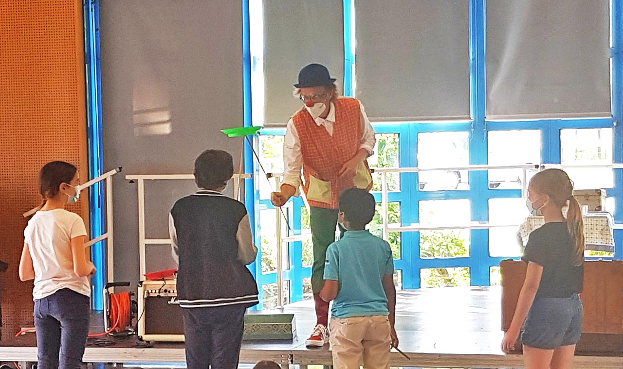 Clown Lolek macht eine Fahrradtour durch Deutschland, da er sich etwas verfahren hat, landet er in Frankreich. Schnell merkt er, dass er auch in Frankreich jonglieren, zaubern und Musik machen kann. Mit Hilfe der Kinder präsentiert er sein kunterbuntes Programm mit Höhen und Tiefen, Brezeln und Hüten mit drei Ecken. Während des Programms tritt Lolek immer wieder in einen Dialog mit allen Kindern und einzelnen Freiwilligen. Die Lerninhalte , z.B. Farben, sind in die mehreren Programmpunkten integriert und werden interaktiv mit den Kindern wiederholt.